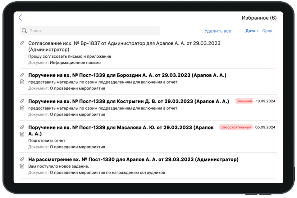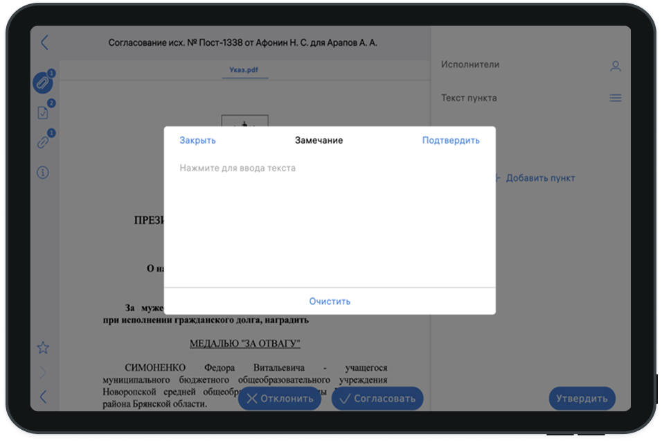 - просмотр документов и приложенных файлов, внесение правок и комментариев, расписание резолюций;